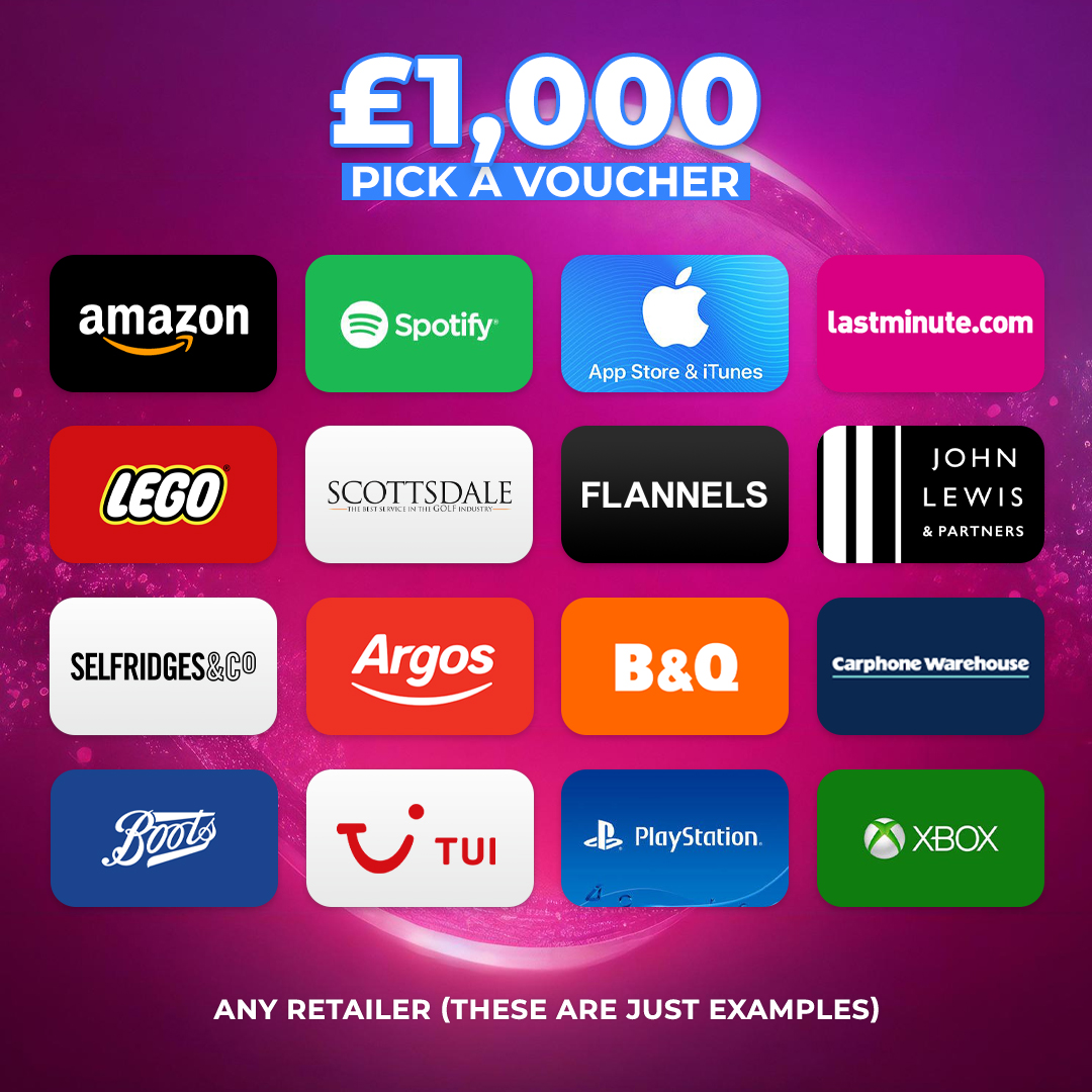 | 1 | 1× | Paragon Pick A Voucher (£1,000) – 50p Entry |
