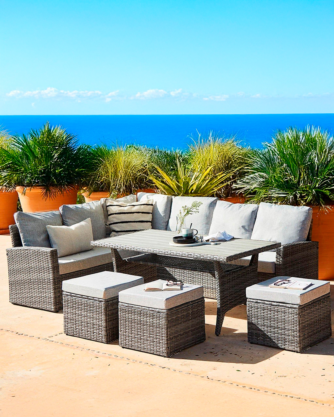 | 253 Stephanie Jones | 9 Seater Rattan Corner Dining Set – Grey |