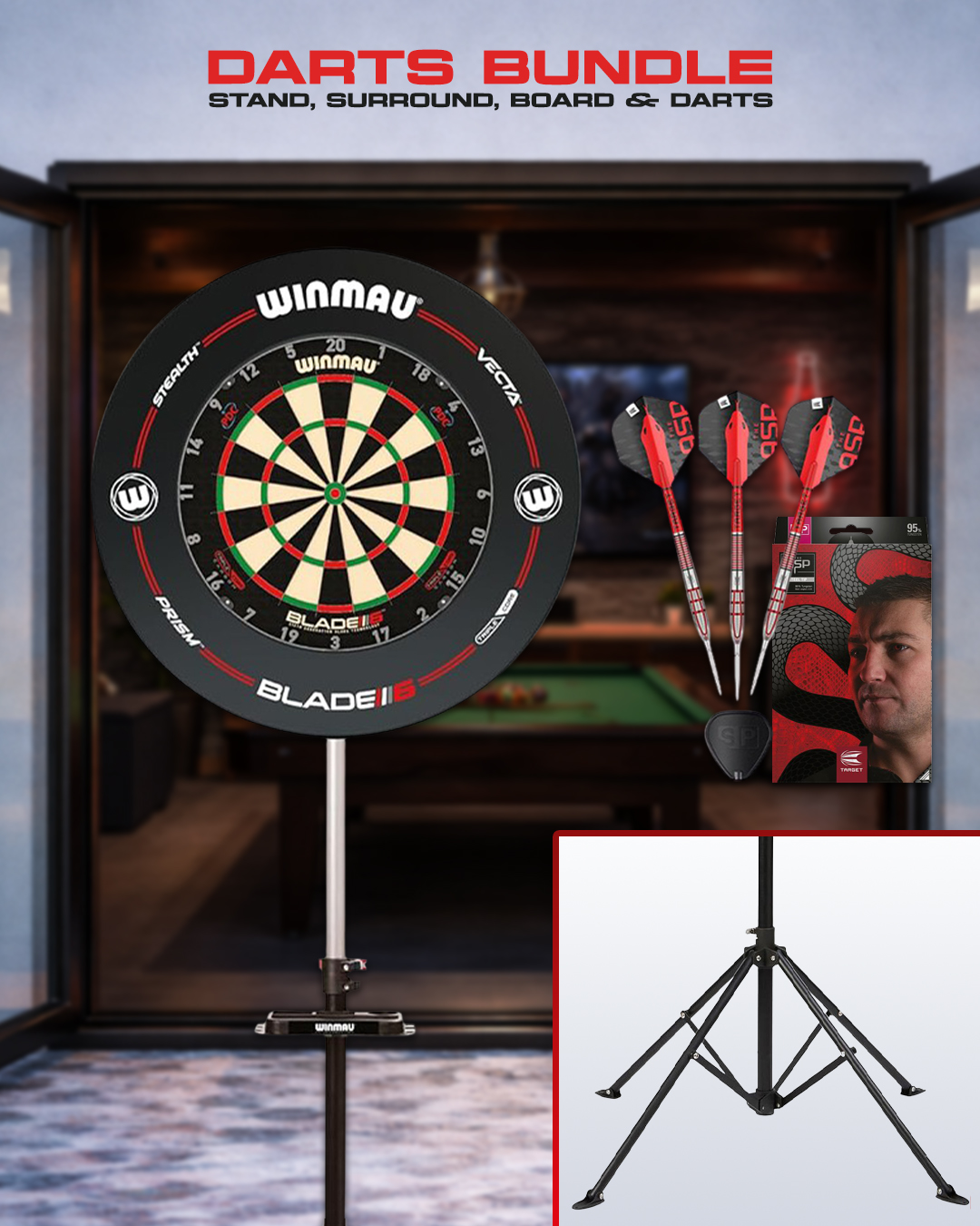 Darts Bundle – Stand, Surround, Board & Darts